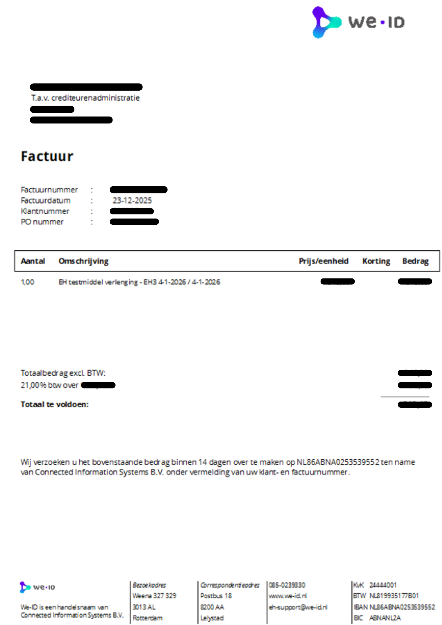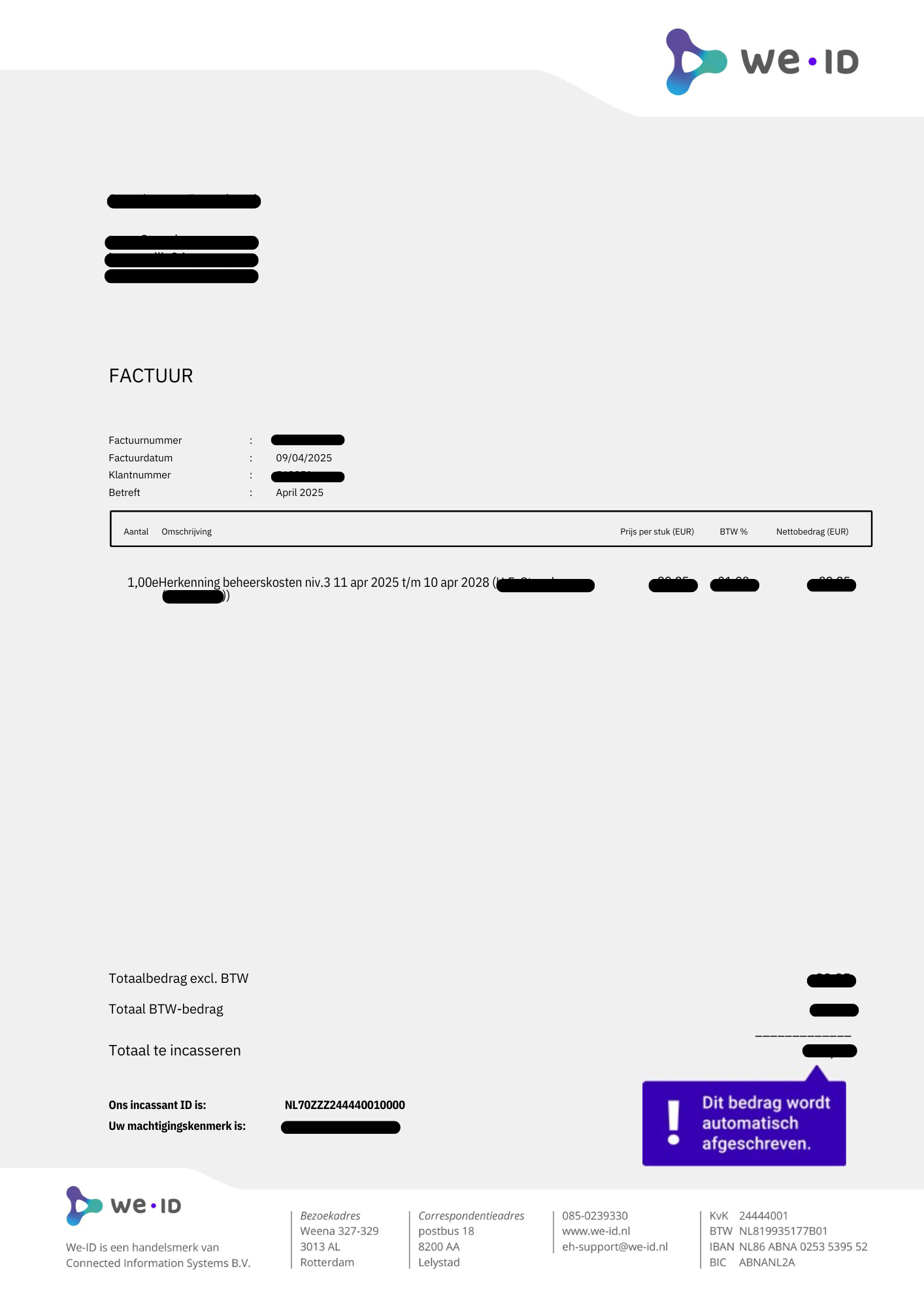 Per 1 januari 2026 is We-ID overgestapt op een nieuw facturatiesysteem. Dit maakt de facturen overzichtelijker en hierdoor kunnen wij u nog beter van dienst zijn bij vragen over uw abonnement(en) en/of facturen.